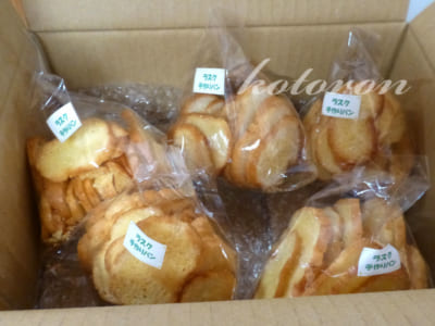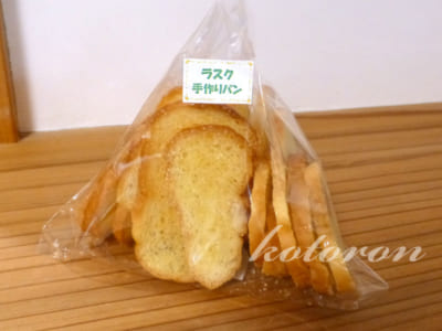 1枚1枚手作りで、大きさもマチマチ。そんなところが懐かしい感じのする、ちょと薄めのラスクです。ラスクって厚いと、前歯の裏の歯茎が痛くなりませんか?このラスクは薄いのでそんなことがないです!