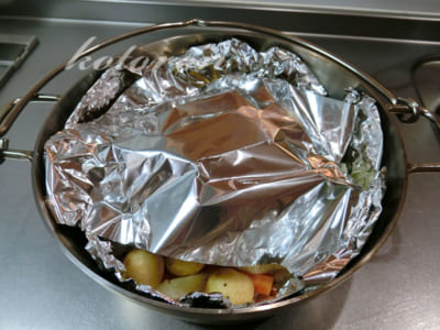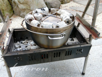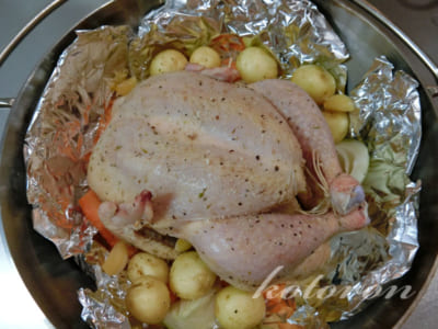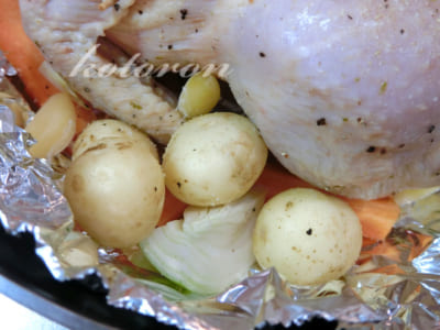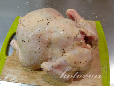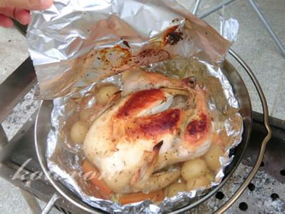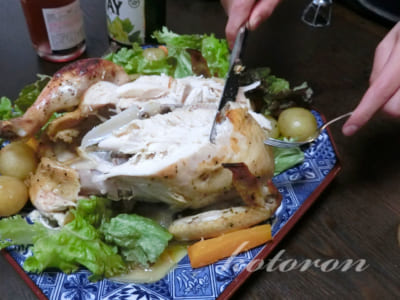 ダッチオーブンで焼いた柔らか丸鶏ローストチキン。