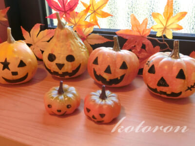 かぼちゃの置物に、家族みんなで顔を書きました。