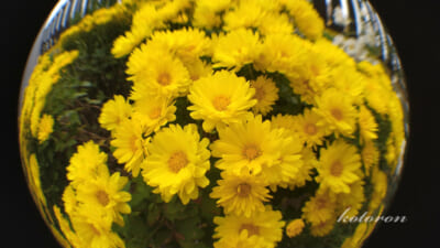 魚眼レンズで撮影した、黄色い菊。