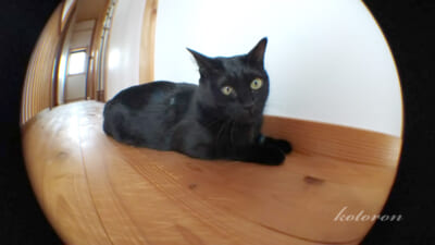魚眼レンズで撮影した、猫ちゃんと廊下。